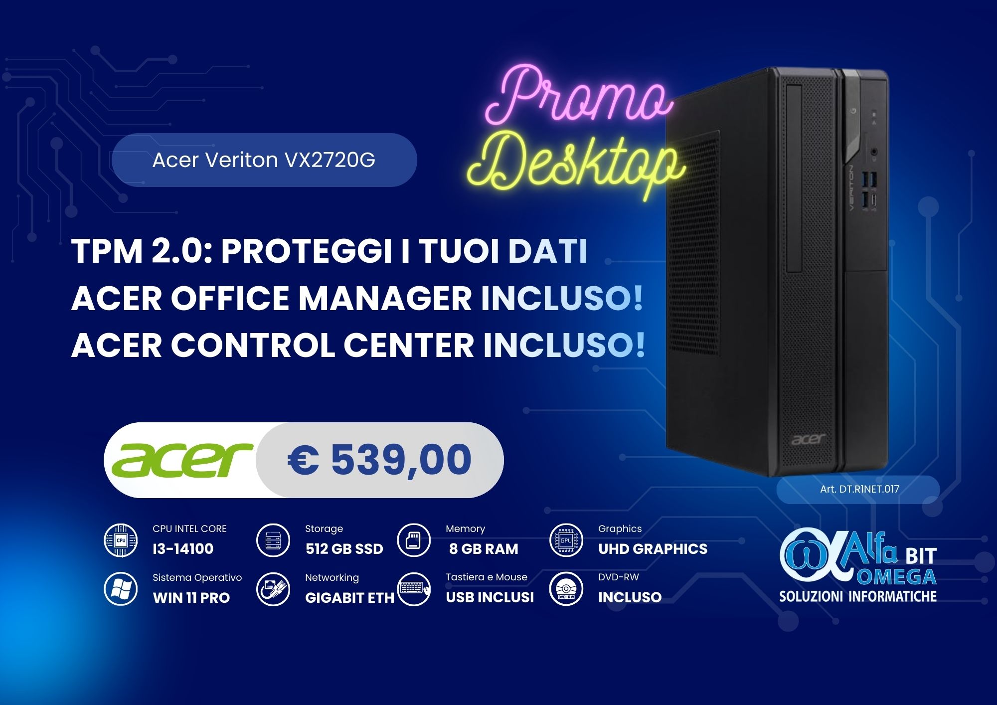 Il Veriton VX2720G di Acer è un PC desktop compatto, solido e pensato per ambienti professionali, uffici e postazioni operative. Dotato di un processore Intel di ultima generazione e sistema operativo Windows 11 Pro, garantisce efficienza, sicurezza e affidabilità per il lavoro quotidiano.